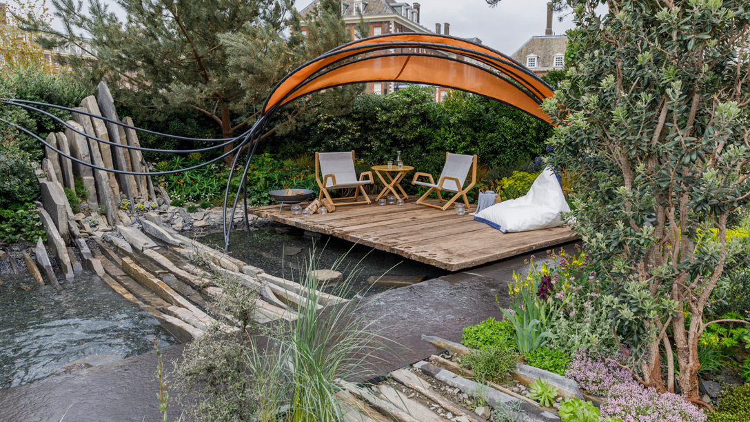 How can gardens help regenerate our ecosystem in response to global warming, pollution and depletion of resources? This garden encourages positive interactions between the four kingdoms (minerals, vegetables, animals and humans) and the four elements (air, earth, water and fire) in order to create balance in joint synergy for our environment. The garden is composed of a pergola with a swing – a relaxation space – located in a dominant position. Human energy provides a swinging motion, which pumps water up to the filtering plants before it flows into the canal and back to the pond. This creates a regenerating process, producing calming ripples while purifying the water.