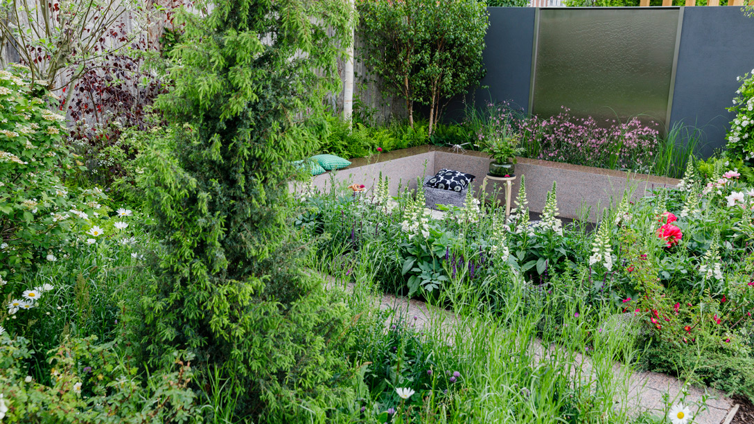 In this urban garden the countryside of Finland, a nation of 188,000 lakes, is represented, melding rural landscape and contemporary design. The boundary fence has been reclaimed from an old barn, the tonal value of its weather-beaten planks picked up in the polished, bush-hammered and flamed granite paving, the benches and floor of the sunken garden – this a nod to traditional stonemasonry. A cascading water feature symbolises rivers and rapids as well as Finland’s cultural relationship with fresh water.