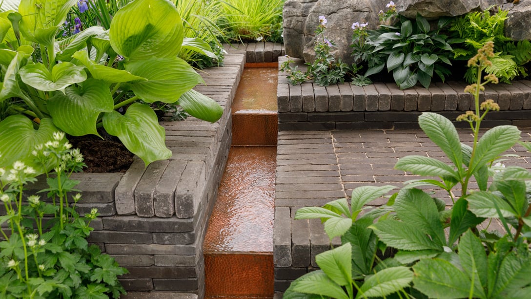 Through the stone boulders at the garden’s entrance the eye is drawn down the wide stone steps and into the inner space. It has a large open ceiling void that engages the viewer with the scented rose bed. A semi transparent, teal, etched botanical water wall moves the air within this space and acts as a foil to the planting and single juniper bonsai tree that is positioned within.
