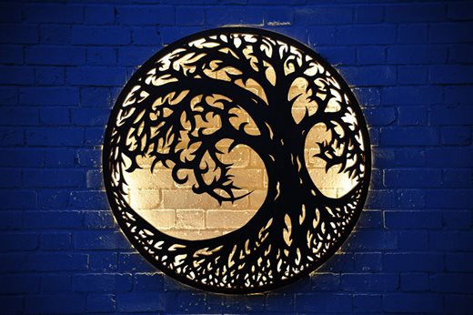 The Firepit Company has created an illuminated steel wall mount, handmade in the UK. The design shows a tree from root to branch, filling the entire circle of the wall mount.