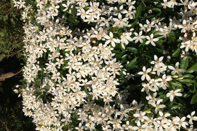 Ferns, hardy tropical plants and grasses such as Stipa tenuissima and Stipa gigantea feature throughout the garden. White spring flowers, including newly-launched Choisya ‘Greenfingers’ (pictured right), are scattered throughout to create an overall calming palate of green and white.