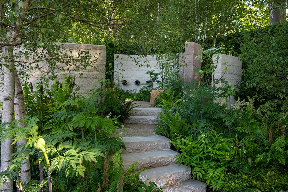 Image: The Mind Garden by Chelsea veteran Andy Sturgeon featured tactile clay-rendered walls and several distinct plantings including this shady woodland area, punctuated with stately angelica.