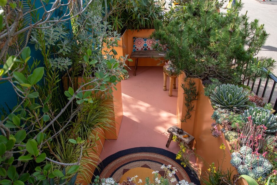 Image: The Blue Garden, designed by Tom Wilkes-Rios, is an immersive balcony garden, featuring vibrant colour and planters crammed with succulents.