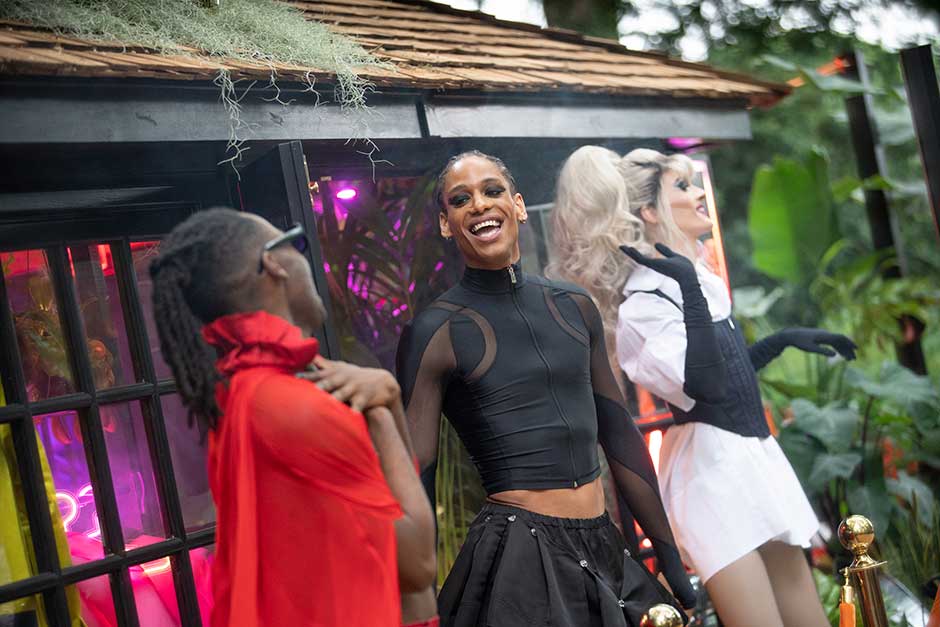 Designed by The Aroid Attic, Social Media Versus Reality was filled from floor to ceiling with greenery. Spanish moss and orchids climbed over a vintage ladder, a glass cabinet was packed with unusual plants and a living chandelier was created from orchids, airplants and gnarled wood.