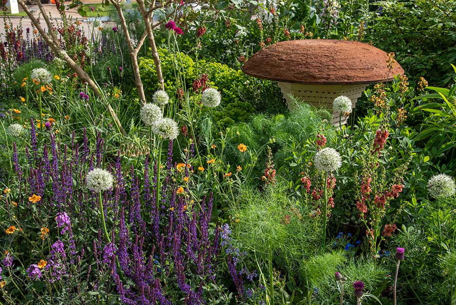 The garden hummed with pollinators drawn in to its colourful matrix of flowers, with plants from the RHS Plants for Pollinators list including Hesperis (sweet rocket), salvias, hardy geraniums, euphorbias and Viburnum opulus (guelder rose). Spring stars such as alliums and foxgloves rubbed shoulders with long-blooming plants such as geums and Knautia macedonica.