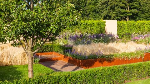 The structure of the garden is a modern urban square with countryside-inspired elements that will help the owners to reminisce. While tactile recollections, such as the feel of wheat are directly recreated through plants, the design also alludes to other traditional details of the the rural landscape. Hedges of different heights portray hedgerows and a rill running through the garden represents a stream.