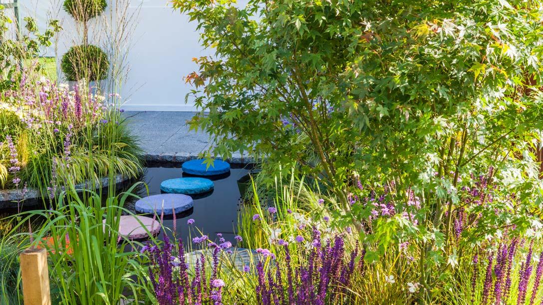 It is 60 years since the renowned landscape architect, Sir Geoffrey Jellicoe, created his roof garden at Guildford. The garden was inspired by the first sputnik launch. The garden aims to bring heaven and earth together. The pond reflects the skies above. Stepping stones, representing the planets and leading to the galaxy, appear to float over the water, and lead to a backdrop of stars forming the plough constellation.