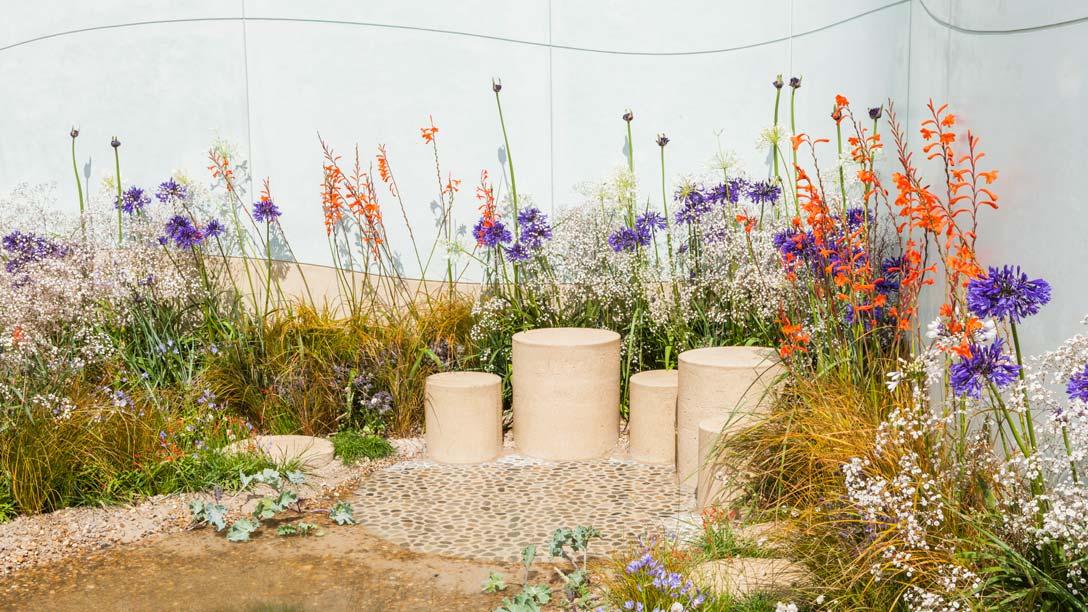 The orange and blue planting palette is unusually striking and inspired by the recent painting by Natasha Tayles in her recent abstract study of Orange & Blue an artistic expression of harking back to nature, using stunningly bright circles of orange and blue.