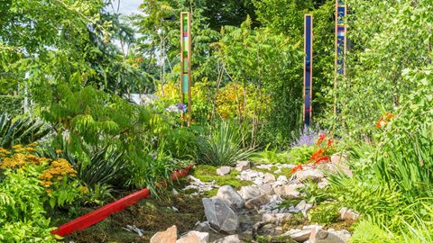 The colours and textures of the planting are central to the design. Flowering plants are the visual mainstay of the display using basic colour blocks of red, yellow and blue plants. The ‘lower order plants’, including liverworts and mosses, primarily focus on foliage texture and are planted below Acer palmatum ‘Crimson Queen’, which provides shade. Loose stone stacks and coloured steel poles seperate the planting scheme into blocks and enliven the scheme.