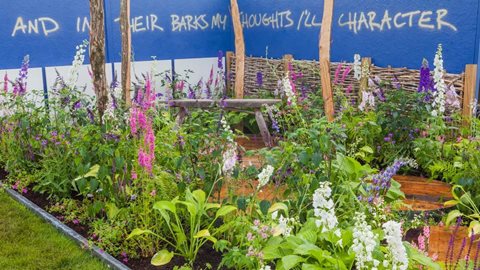 In this design, the garden is treated as a platform for thought. The four sculptural willow limbs, cleaved from a single old trunk create blank pages, inviting the viewer to ‘character’ their own new narrative from something that has gone before. The garden echoes the action of Shakespeare’s As you Like it.