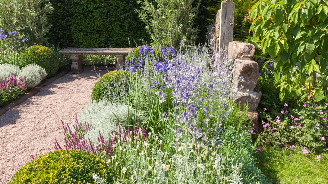 Each garden highlights the diversity of Cholmondeley Castle Gardens. One side represents a formal silver garden in which tall echiums give height, Buxus balls provide structure and mounds of silver foliage are punctuated with the spikes of Salvia and spiky Onopordum. In the adjoining plot, an informal woodland-style garden has a more natural feel.