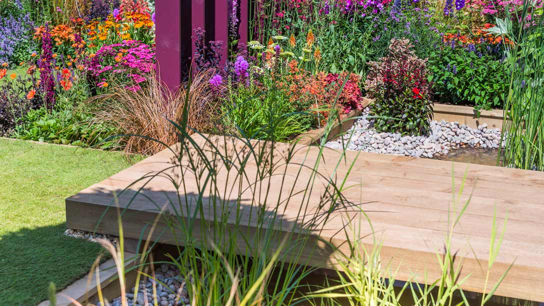 Intended for a mature family that enjoys spending time at home and in the garden, this design provides space for the occupants to explore, sit, relax with a favourite hobby, and dine away from view of neighbours.A decorative, vertically slatted wooden boundary assists in splitting the garden into rooms. It continues with the low internal slatted fences cutting into the garden. A sleeper bridge carries the visitor over a sunken, shallow pebble pond.