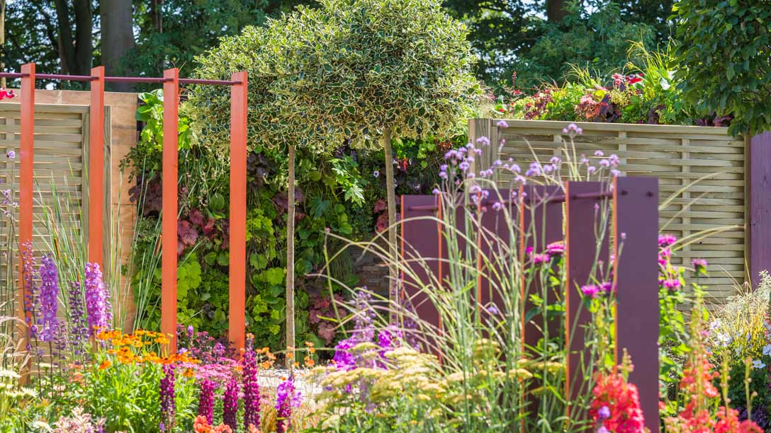 A multifunctional garden offering a selection of vistas and cleverly using woven fencing and hard landscape features to dissect the space into different garden rooms