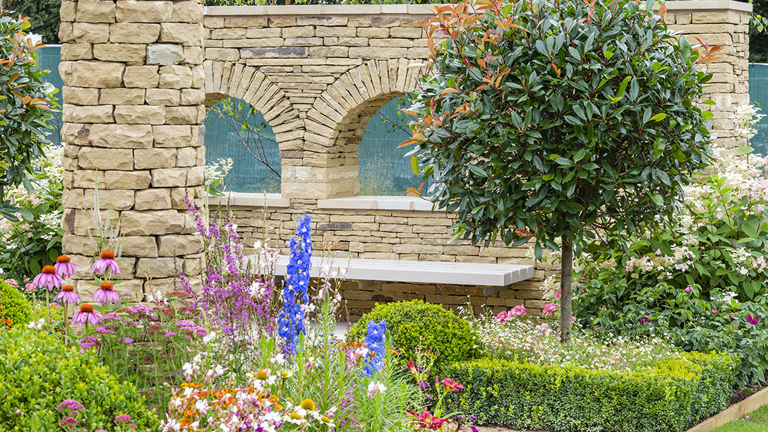 Designed and built by experts from Cheshire, Lancashire and Cumbria, the garden is a celebration of the North West. It is inspired by the poem Up ’ere by Tony Walsh and by the work of Lancashire landscape architect Thomas Mawson.The Mawson influence can be seen in the craftsman-built dry-stone wall with arched windows and the circular stone pillars, and in the abundant flower borders contained within a formal framework, which is typical of Mawson’s designs.