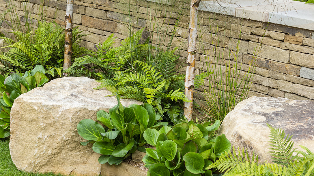 - Beyond the back wall of the garden, boulders, ferns, long grasses and silver birch trees reflect the wild landscape that would exist beyond the garden