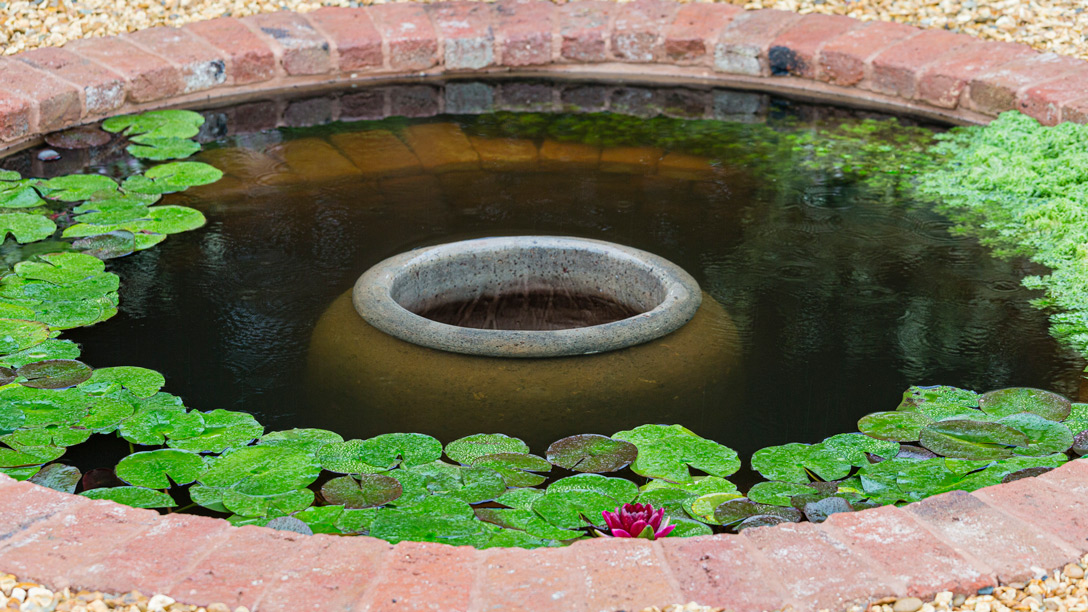 The garden features Baroque terracotta urns and a patio of handmade bricks overlooking a formal lily pond. The planting, in contrast to the formal layout of the garden, is wild and diaphanous with delicate white flowers.