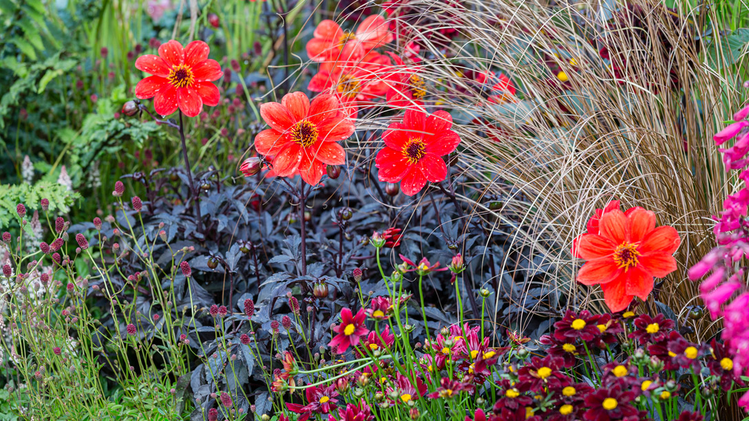 The planting scheme illustrates cyber crime with the lighter tones representing crime prevention and the darker shades depicting crime being committed. Plants including deep red Dahlia ‘Arabian Night’ and fern Pteris umbrosa contrast against the steel structures. Two specimen Acer palmatum trees add height, movement, colour and texture.