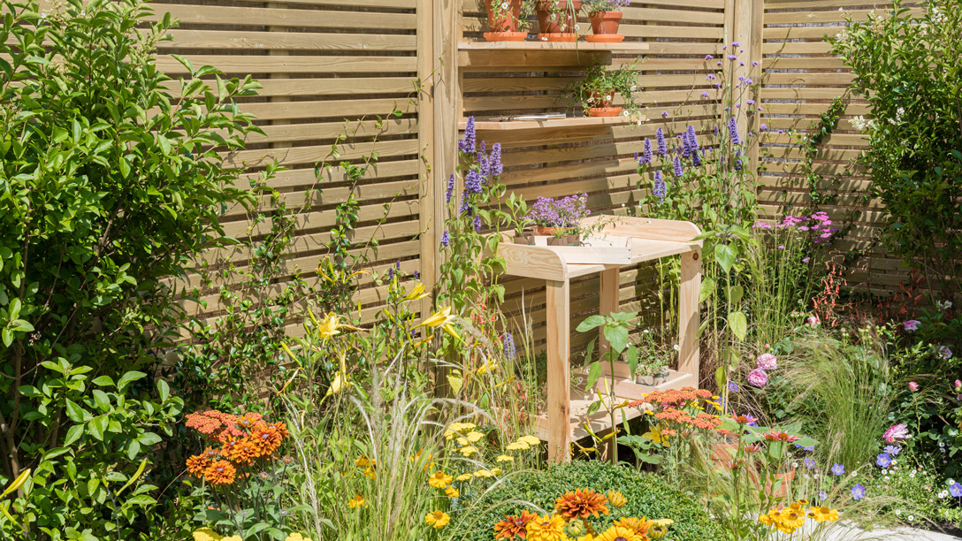 The garden works in synch with the weather. An arbour with a green roof provides shelter from sun or rain and slows down rainfall in the process. A potting area shows how easy it is to grow your own flowers from seed and meteorology equipment allows the gardener to keep a check on the weather.