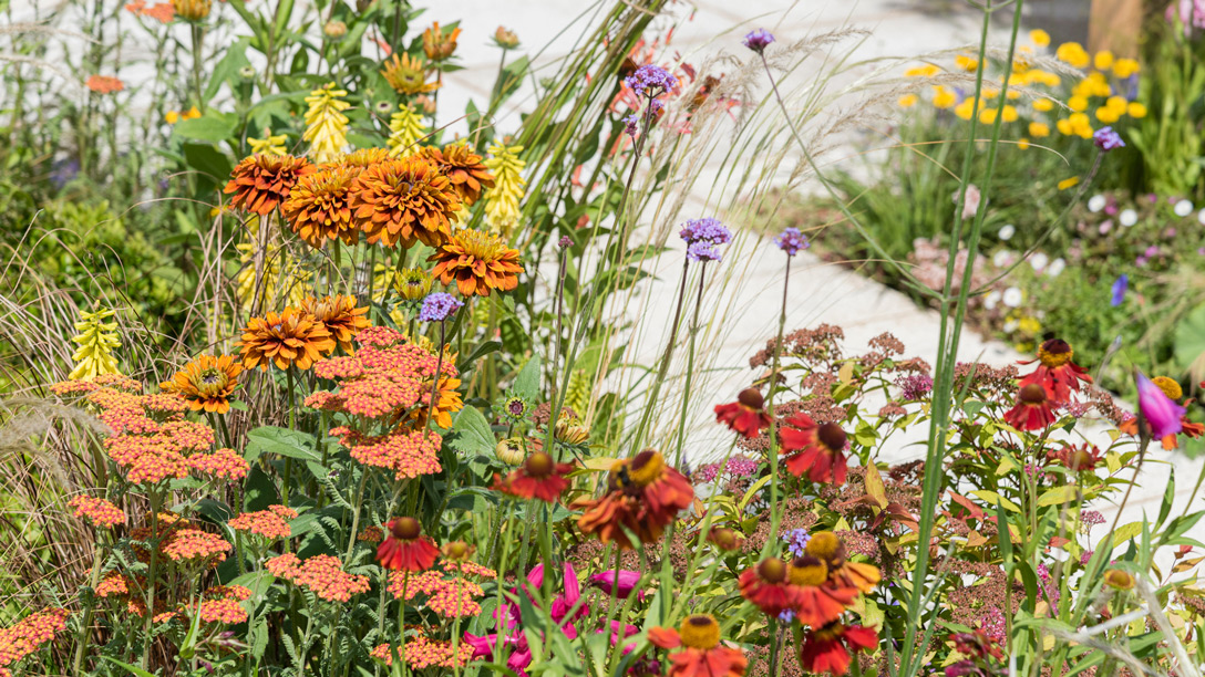The nectar-rich, prairie-style planting features heleniums in egg yolk yellow to citrus orange, bringing instant sunshine, together with blush roses paired with pink geraniums. Sunflowers provide drama and excitement all through the garden.