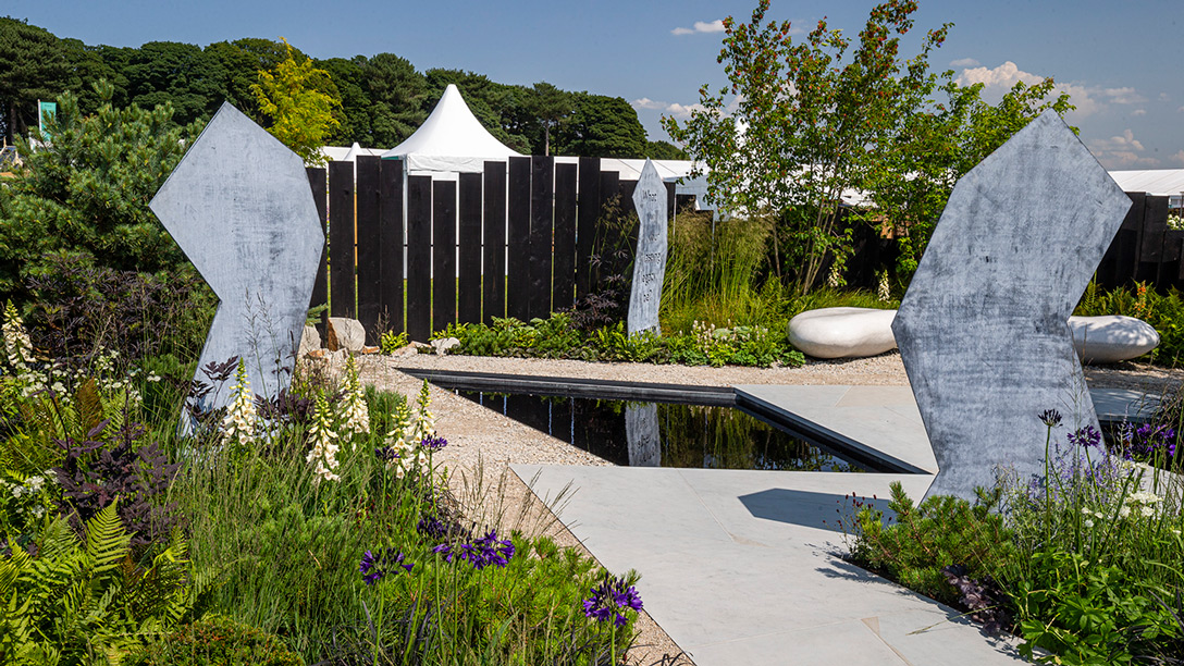The twisting pathway through the garden’s centre and across a reflective pool, symbolically illustrates how Macmillan provides support through the often confusing and painful journey of a cancer diagnosis. Three large sculptural monoliths represent how one third of Macmillan’s income comes from gifts in wills. Plants and surfaces are initially sharp, jagged, dark and brooding, becoming more vibrant then calming around the seating area.
