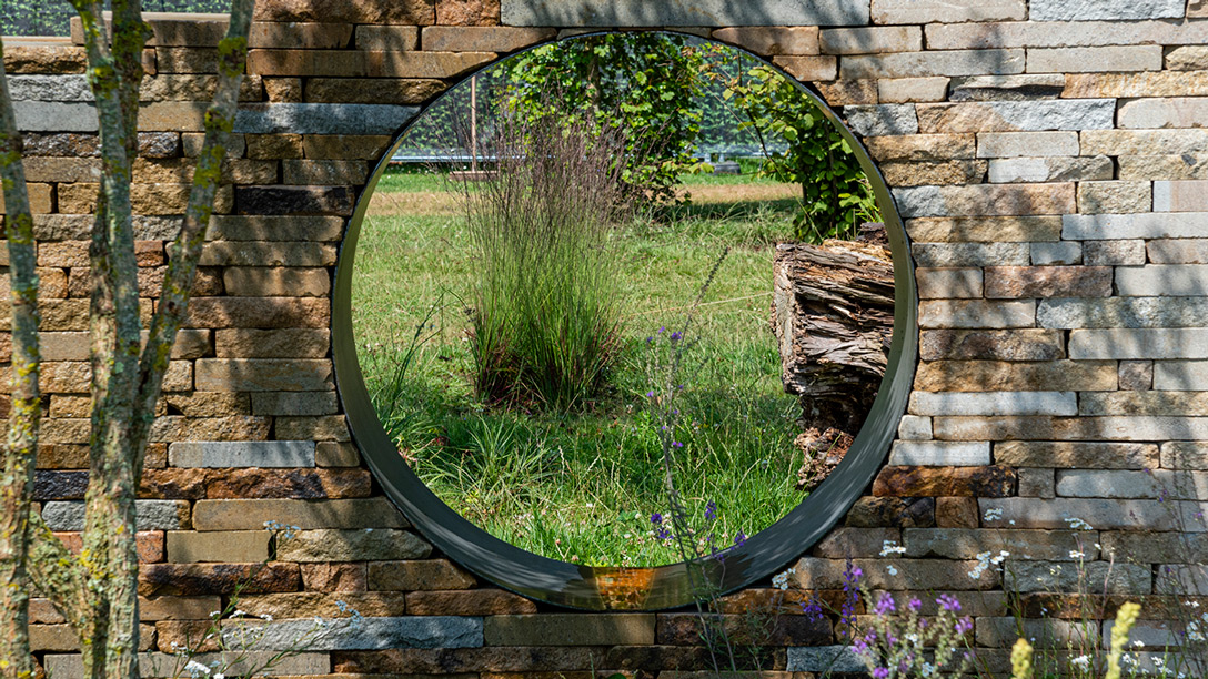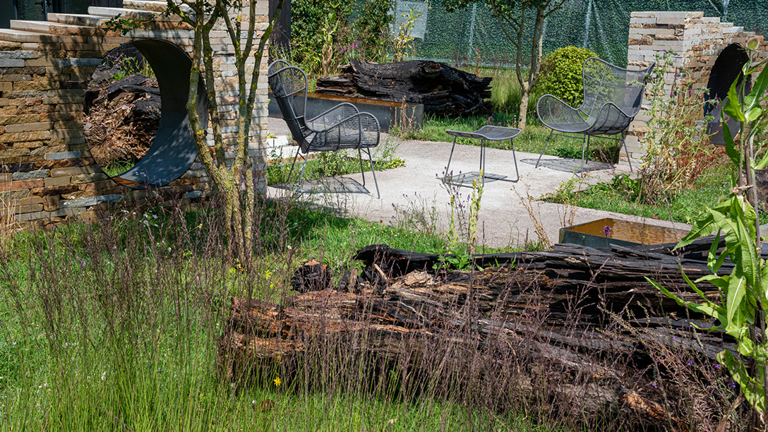 - A dramatic drystone wall, made of sandstone from a local quarry, helps frame the space and cuts a dramatic dash against the hoggin paths, water troughs and reclaimed tree stumps