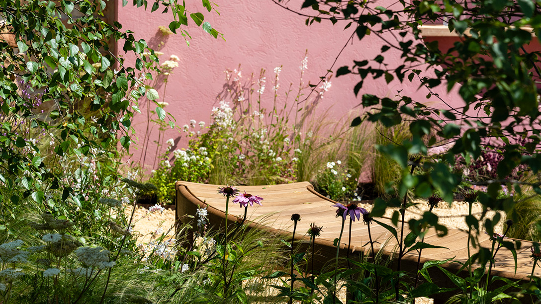 - The colour pink is frequently repeated through the garden, picked up from the stone wall to painted concrete elements and planting including salvias, sedums, and echinacea