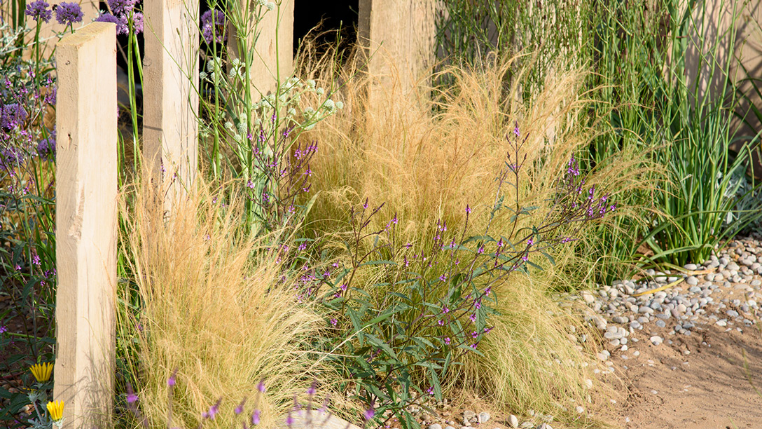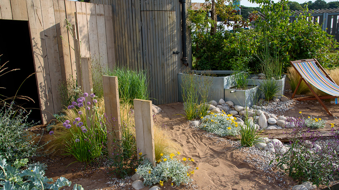 The rain garden is constructed from three linked upcycled steel water tanks or troughs that overflow and drain into a swale that runs down to the front of the garden. The boundary is constructed from upcycled scaffold boards, which also feature in a seating area that contains two star-gazing chairs and is accessed by a grit path. The plants are wind- and salt-tolerant and found in coastal areas in the North West.