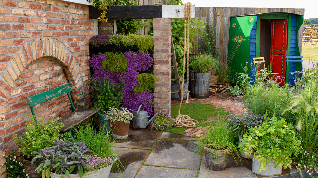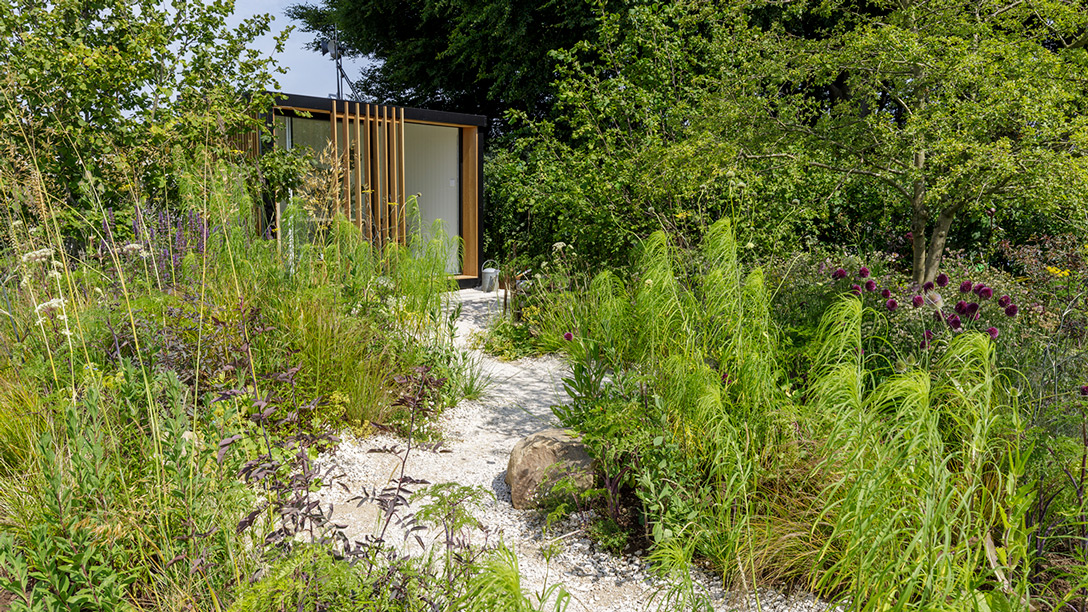 The structures reflect features of the canal: a vertical planter of creeping thyme depicts a lock gate with its cascade of water; a deck and covered walkway represent the hull and cabin of a canal boat with its flat-roof pot plants; and a wellbeing bench made from reclaimed wood and ladders is a nod to the ducks that nested behind an old ladder in designer Chris Swift’s tiny garden during lockdown.