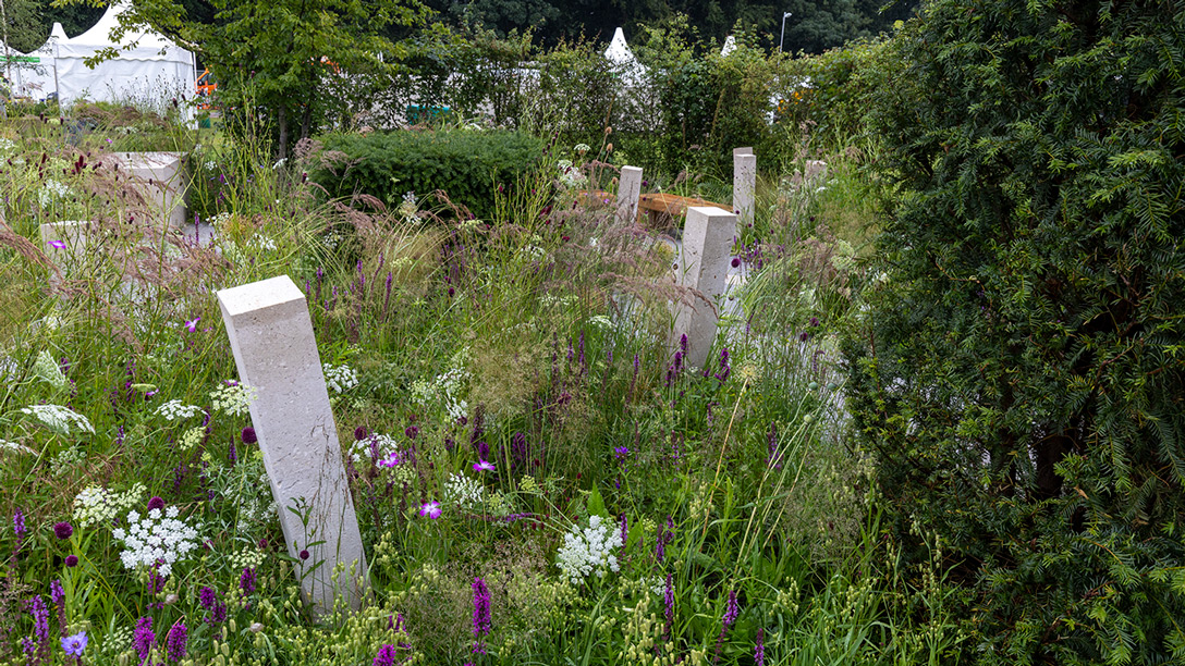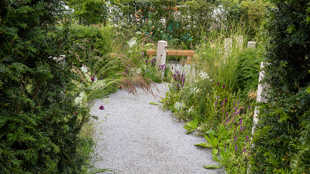 The garden opens with a yew gateway, as yew is a symbol of immortality and a common churchyard feature. A stone structure represents mortality, while pillars are markers on the way through grief, showing that there is a path forward.