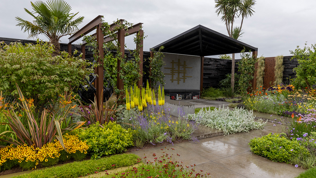 Low-maintenance, drought-tolerant plants, including Phormium tenax and Punica granatum or pomegranate, are chosen as their growing conditions represent the dry eyes caused by screens and the decrease in activity and self-care. Eye-catching yellow foxtail lilies and blue agapanthus provide a punch of colour.