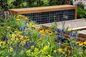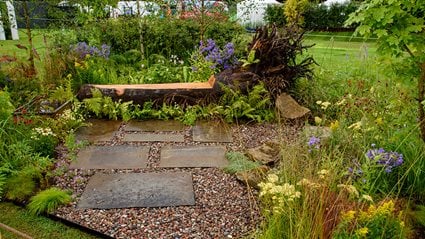 - The garden makes use of reclaimed materials (oak totems, stone boulders, slate in gabion, bricks for raised planters are reclaimed).