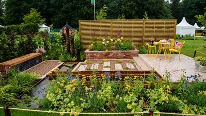 The garden’s focal point is a fallen tree. Far from being seen as a nuisance that requires removal and chipping or burning, the tree has instead been transformed into a centrepiece seating area.