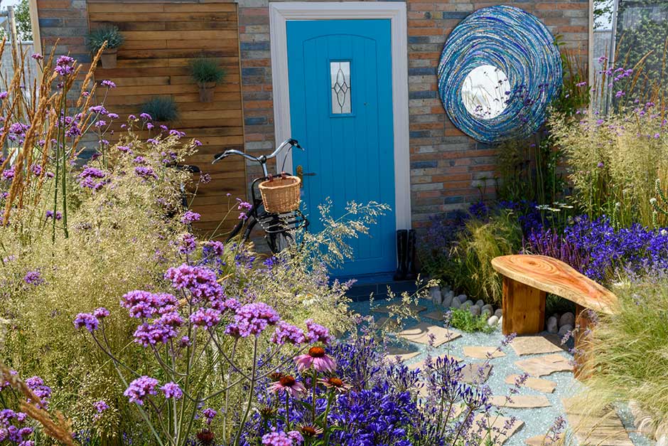 a local park in Lancashire all provided inspiration for easy to achieve planet-friendly gardens at home with a rain garden, upcycled materials, wildlife-friendly features and meadow-style planting.