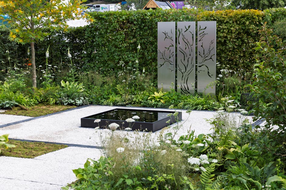 Proving that tranquillity can be created in even the smallest of borders with a bit of thoughtful planting, colour and design, Head In The Clouds encourages mindfulness and quiet reflection. Central to the design are a series of shallow, still reflective pools that echo the sky and clouds above, symbolising self-reflection and inviting inner calm. The planting features a calming palette of whites, silvers, and soft blues to echo the sky and promote tranquillity.