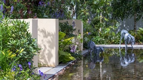 Lively sculptures capture the character of dogs, whilst the stillness of the large water feature represents the abandonment faced by stray dogs. The garden’s diverse planting provides a sensory experience accented in yellow to reflect the colour of Dogs Trust’s brand.