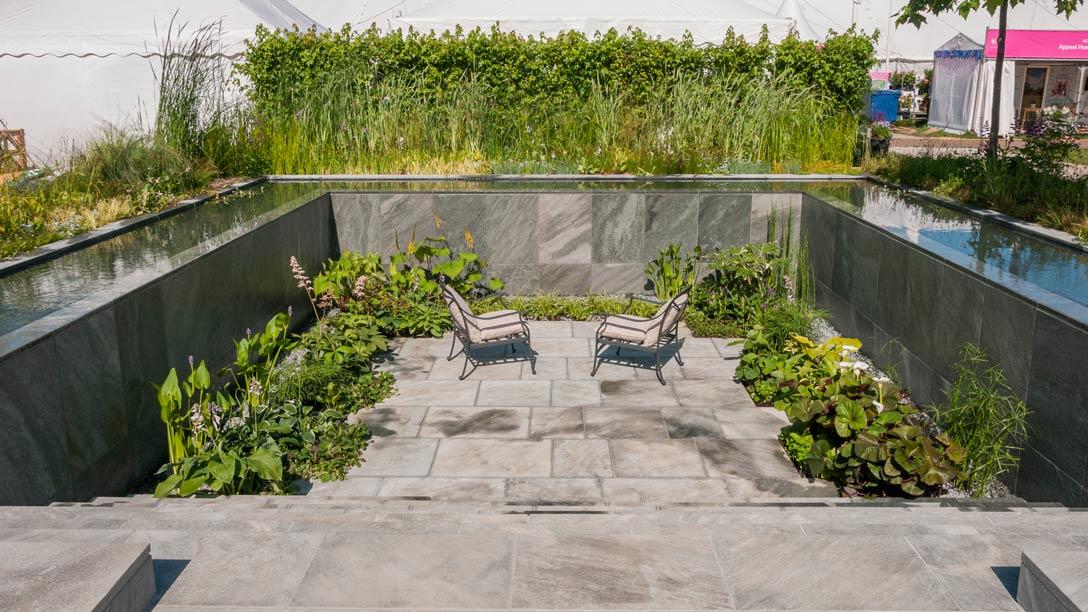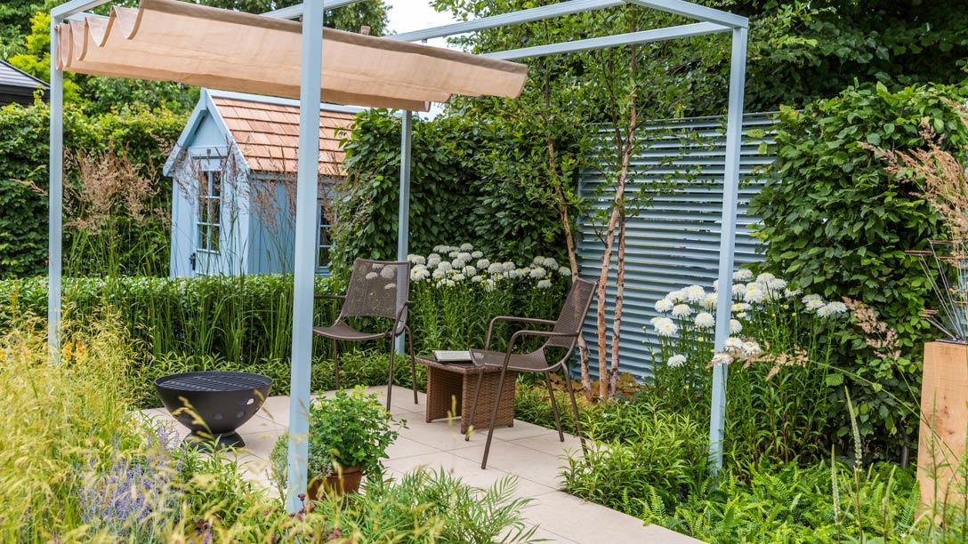 Privacy and a sense of enclosure are provided by two steel louvered panels, clipped hornbeam hedge and a steel pergola with retractable shade. The steel panel is a backdrop for the architectural multi-stemmed birch, which offers dappled shade over the paved seating area. The planting in gravel provides colour and texture and there is the sound and movement of water.