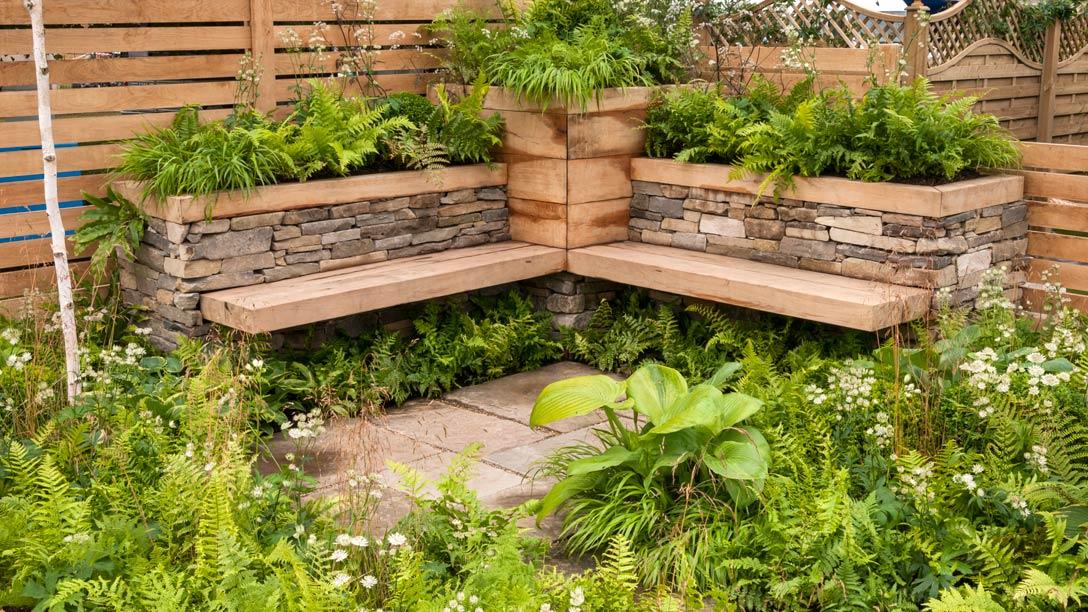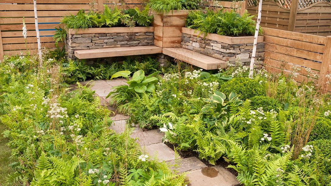 The garden is designed to bring a woodland environment to a city garden. Natural materials including York stone and oak provide a country feel, and contrast with the modern curving path and contemporary floating benches.