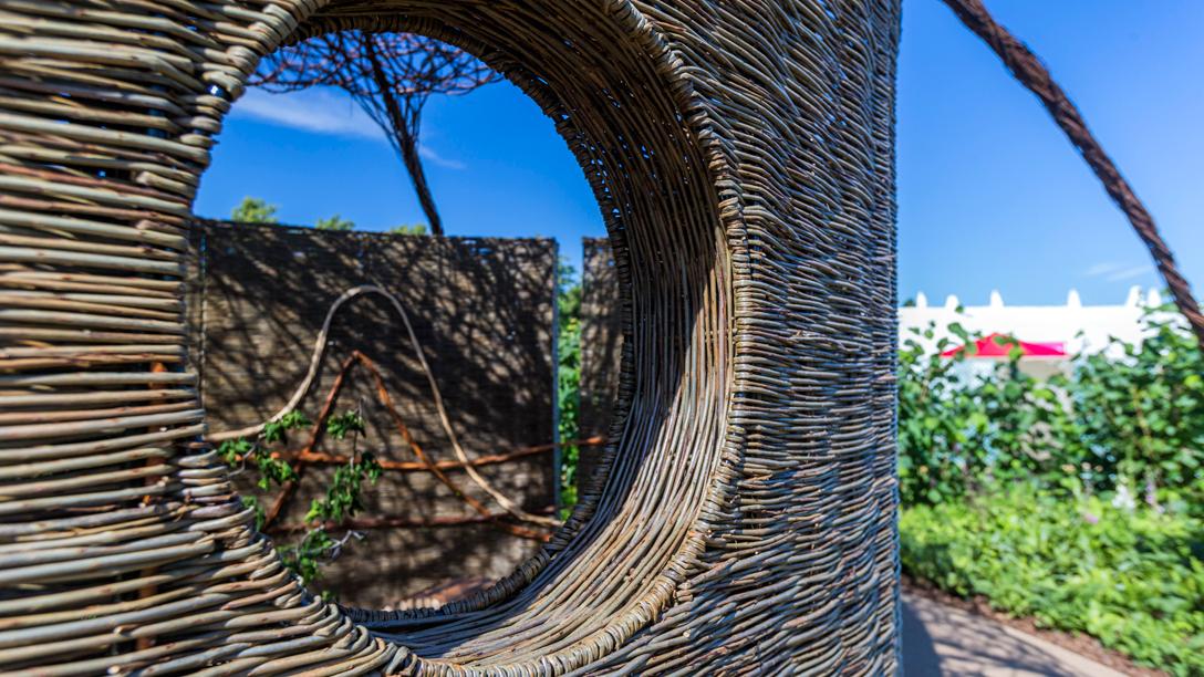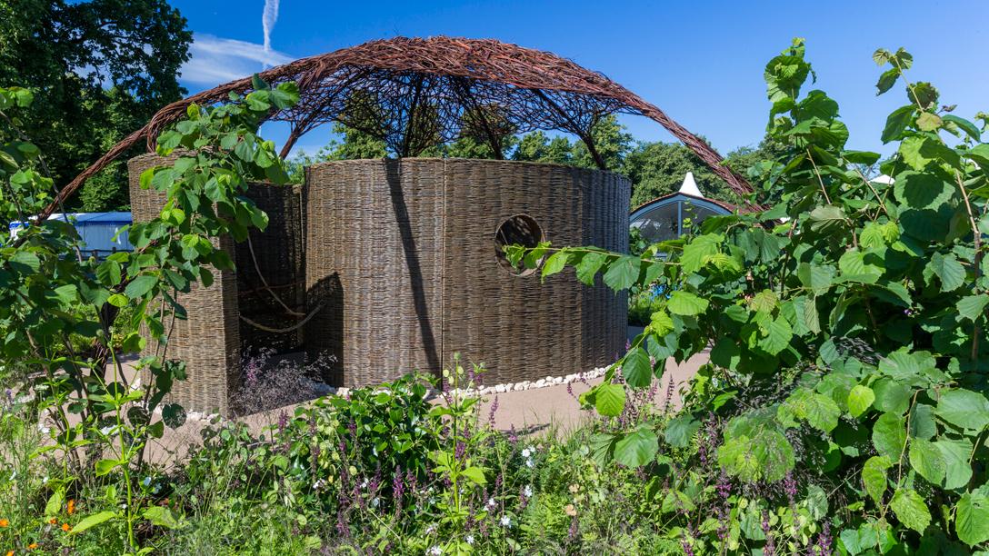Visitors will first see an area of hazel woodland with native ferns and wildflowers. The inside of the garden is hidden from view behind a Somerset willow screen. As visitors walk along the curving path, the inside gradually reveals itself through gaps in the screen until a round window reveals the central feature – a corkscrew hazel in a bed of Bowles’ golden grass. These plants were grown by the Edwardian plantsman E A Bowles in an area of Myddelton House garden that he called his ‘Lunatic Asylum’. He referred to these plants as his ‘maniacs’.