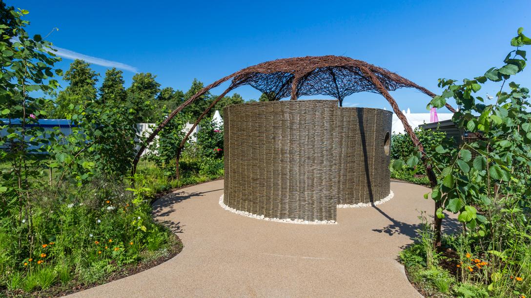 The outside and inside are connected by the overarching willow and steel canopy – symbolising the effect of fluctuating hormones on the brain. The ends of the willow arches ‘snake’ around the bases of the multi-stemmed hazel trees in a style inspired by the land art installations of artists such as Andy Goldsworthy.