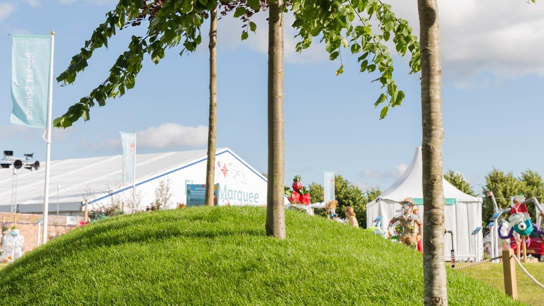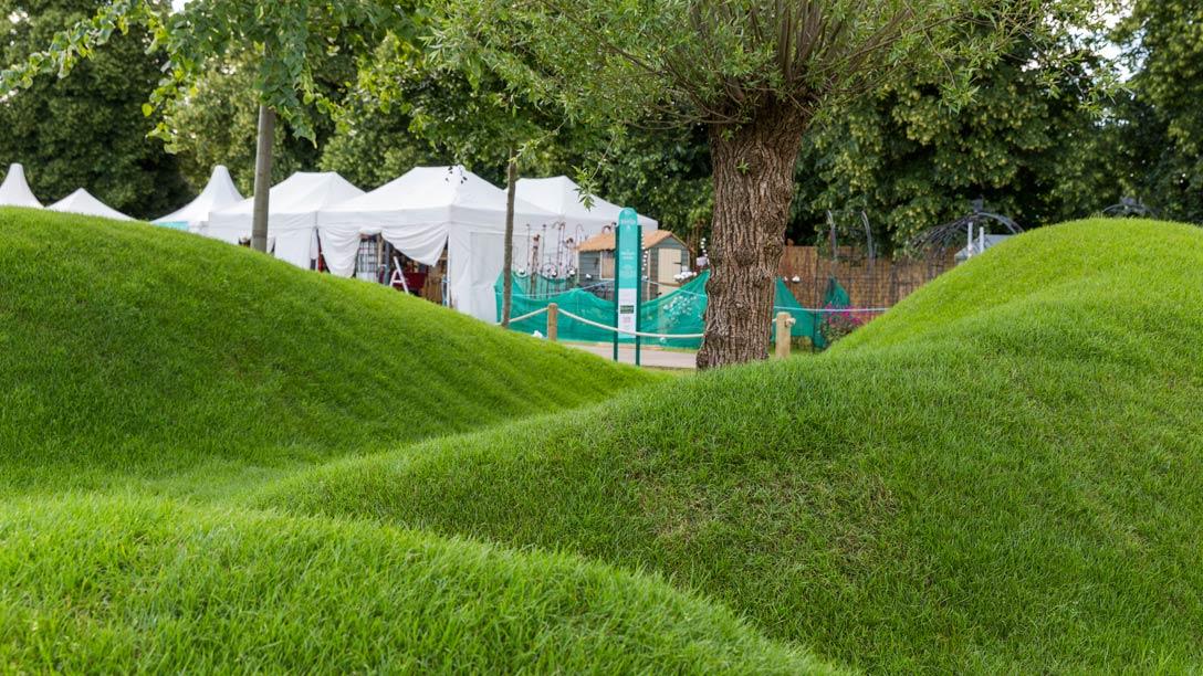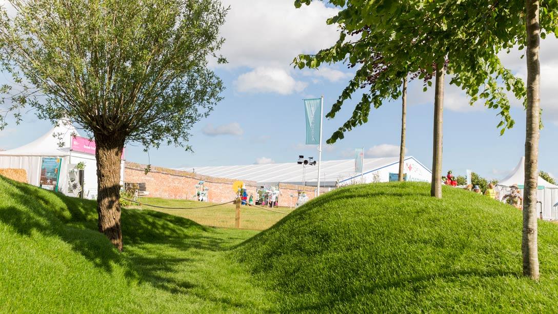 A contemporary homage to Capability Brown’s landscaping of our countryside, the design centres around serpentine landforms creating the illusion of a valley complete with signature trees. A terraced, turfed bench allows the visitor to sit and contemplate the landscape. The surrounding countryside is visible between and beneath the canopies of the trees. Another mound provides an alternative seat and a different view point.