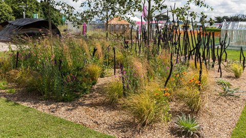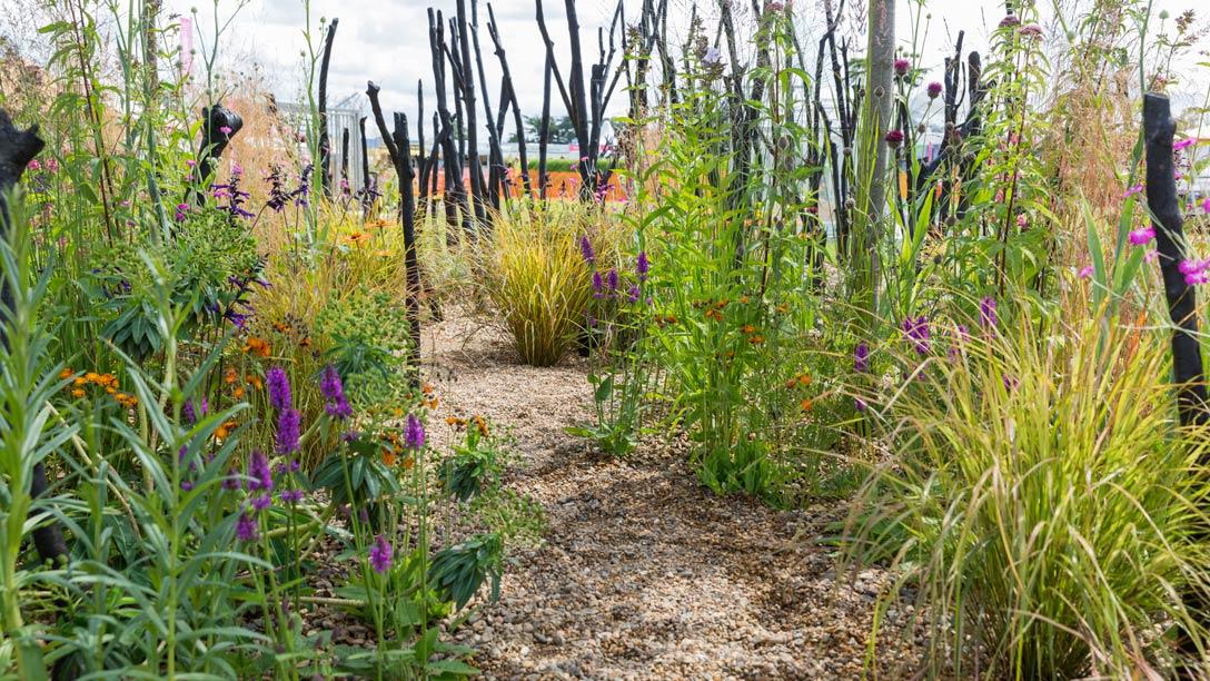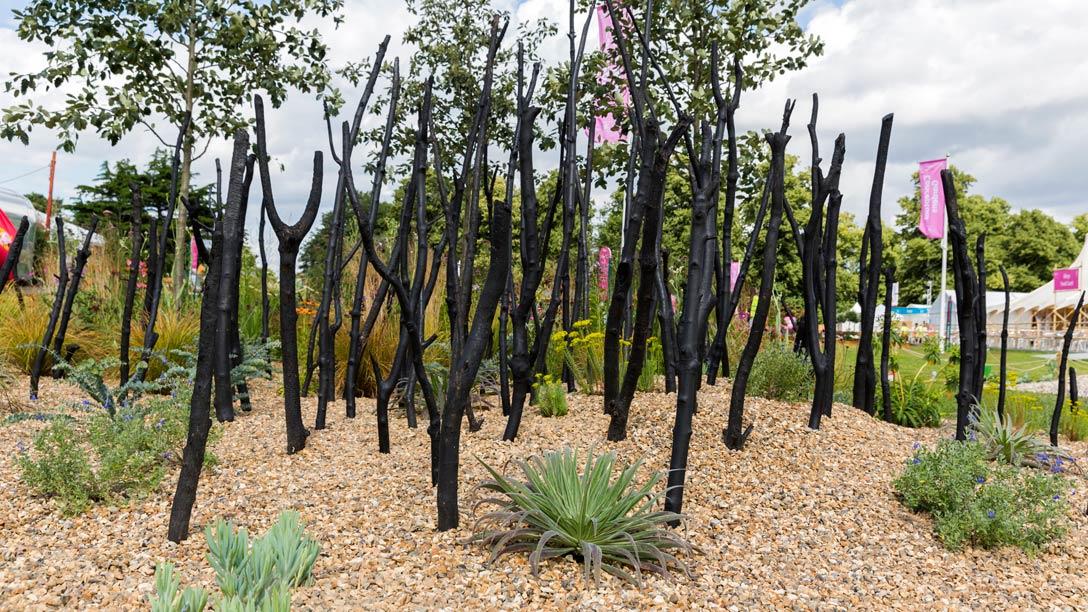 The garden aims to raise awareness of cancer survival rates. Lush planting at one end represents the doubling of UK cancer survival rates in the past 40 years, while the sparse planting at the opposite end indicates that there is still a long way to go. Three specimen trees represent the three percent of people diagnosed with pancreatic cancer who survive five years after diagnosis. The 97 stained branches represent those who do not make this milestone.