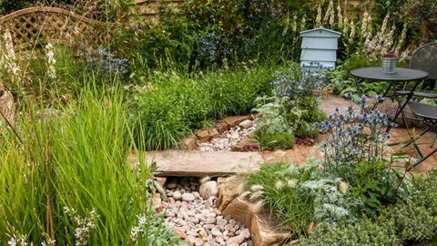 The garden is a sunny refuge from city life. A seating area is reached by crossing either of two small bridges over a dried river bed framed by olive trees. Many of the plants have been chosen to attract wildlife, particularly bees and butterflies, with the addition of a beehive, log piles and rocks to provide safe havens for them.