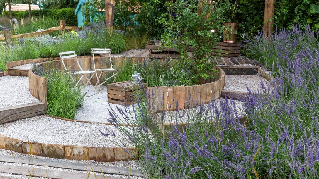 The garden depicts rows of lavenders in a field and a natural combination of wild planting and trees. A circular walkway leads to a hut, and a sunken area provides the opportunity to unwind and take in the atmosphere. Finally a curved bench allows the visitor to admire the garden’s features.