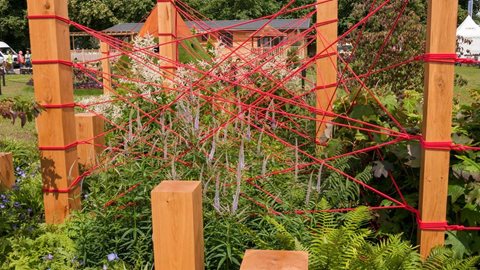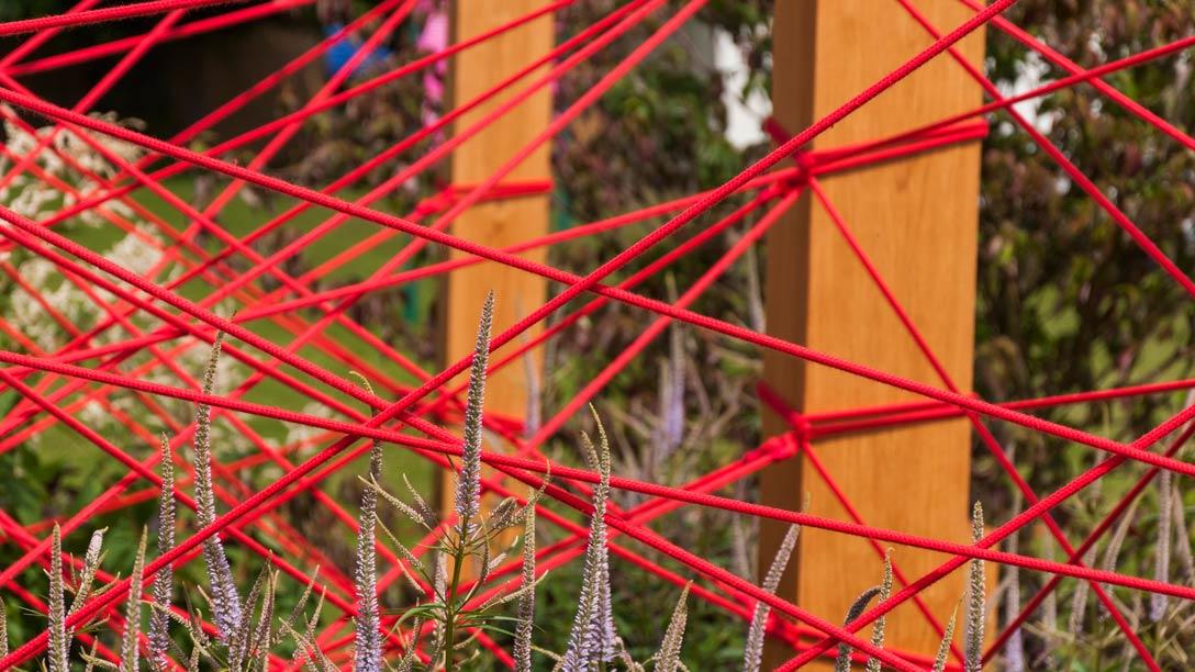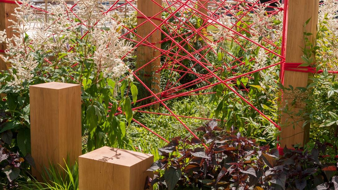 This garden represents a modern interpretation of this myth. Two oak character posts stand at opposite corners of the garden symbolising people destined to meet. Six large oak posts, varying in heights and sizes, are arranged between them with red rope, threaded in a dramatic pattern representing the complex journey destiny can take to connect two people.