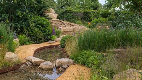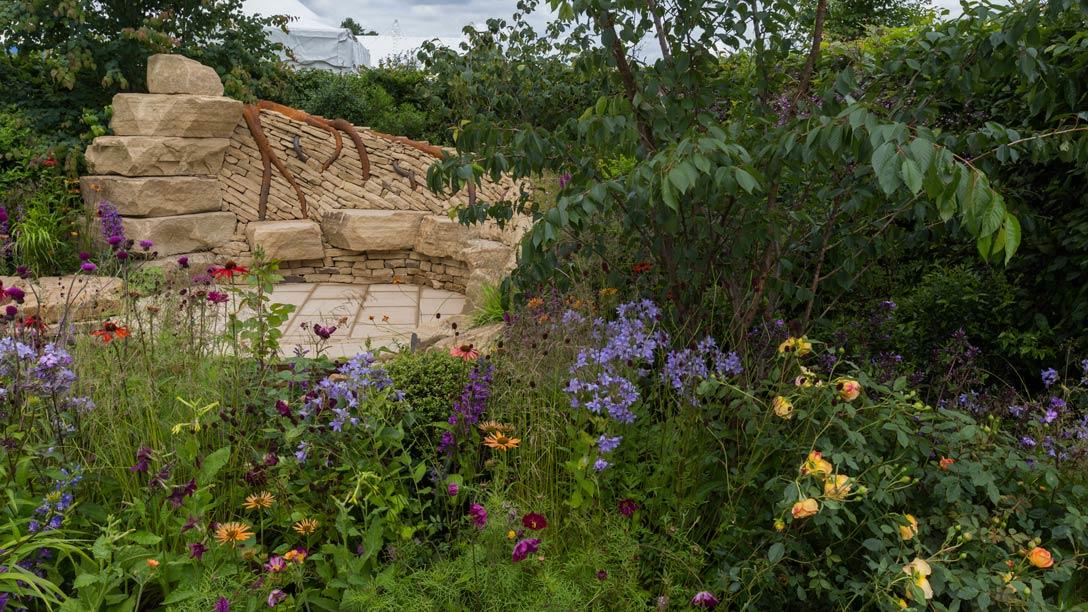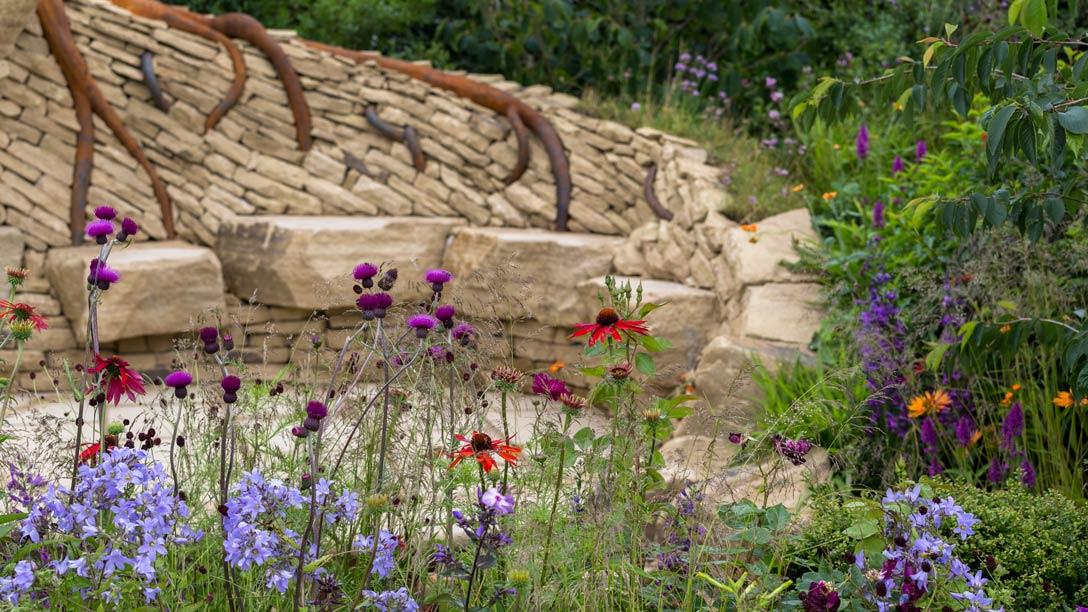 The garden is inspired by the patterns of Yorkshire; dry stone walls define a linear landscape of pastures and meadows, contrasting with gently curving waterflows. At higher levels the wind sculpts the landscape, exposing rocks and shaping trees. A weathered steel and stone seating area provides shelter and connects to the rest of the garden by water that flows into a wilder area of meadow, hedges and woodland.