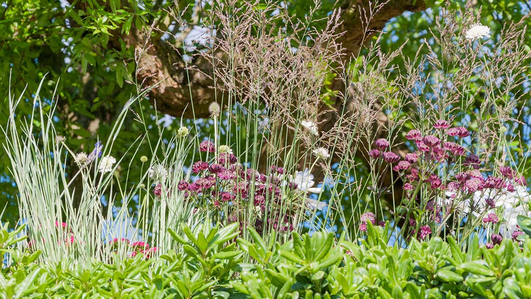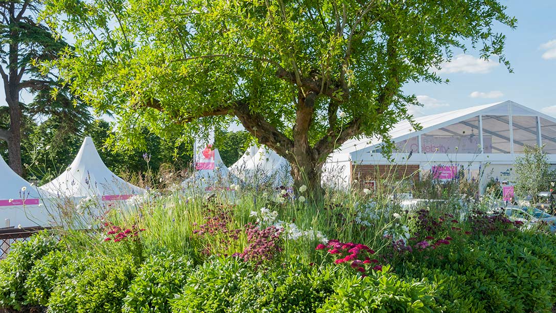 - The symbolic pomegranate tree used here, Punica granatum, is underplanted with meadow-like perennials and flowers loved by pollinators, such as Astrantia major and Achillea millefolium ‘Pomegranate’