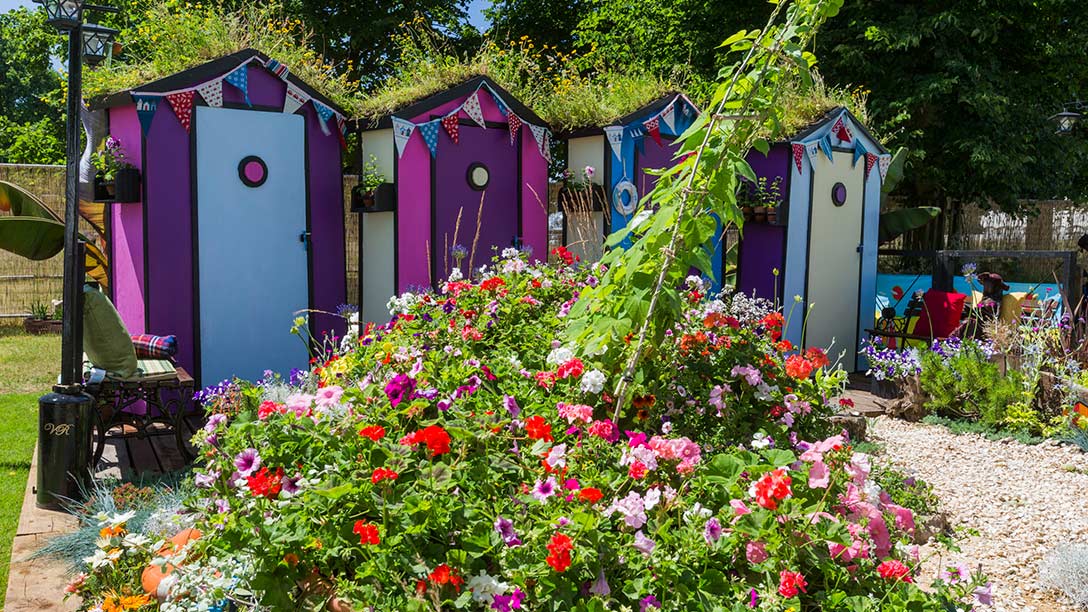 This joyful garden is Southend through and through. Colourful beach huts look out over a sea of vivid planting and a beach of cockle shells