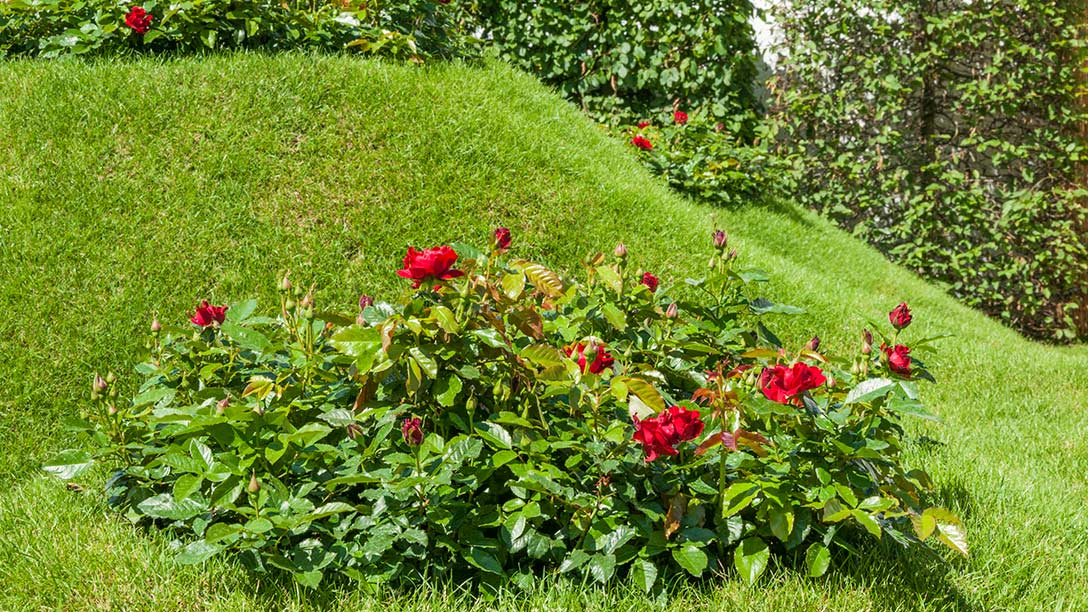 Located on two sites, Tony Smith's signature style of earth sculpture with gently rolling hillocks rising to volcanoes topped with deep red blooming roses spilling from the tops frames the way into the Festival of Roses