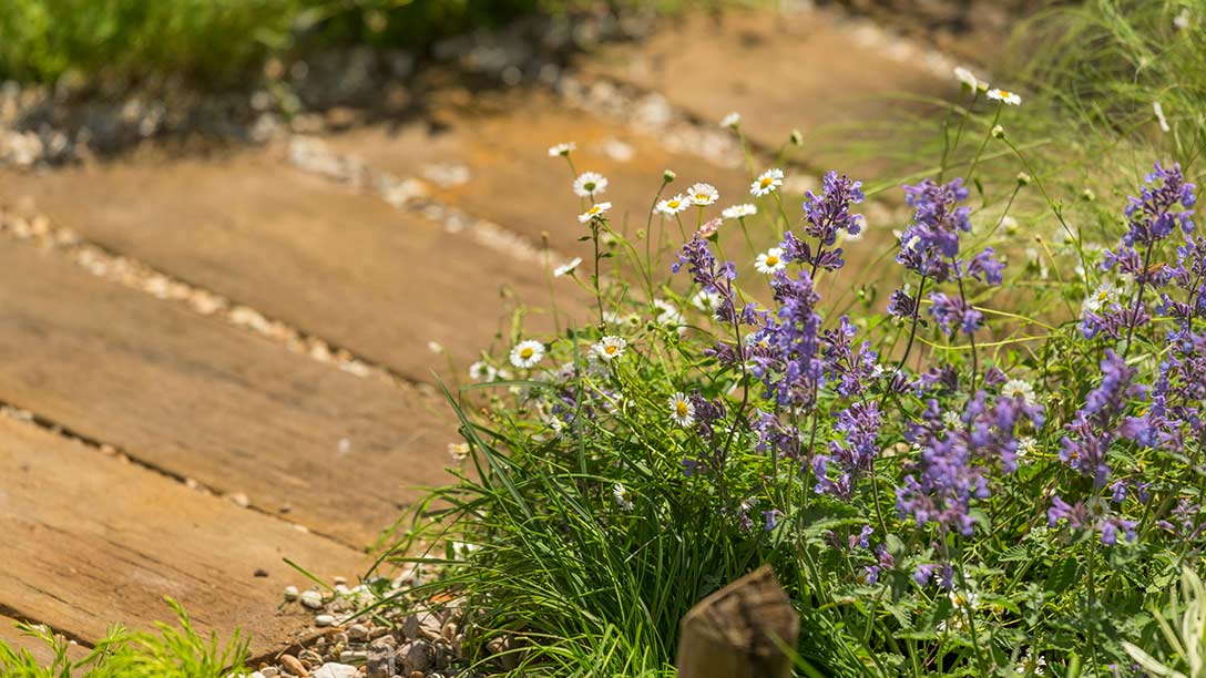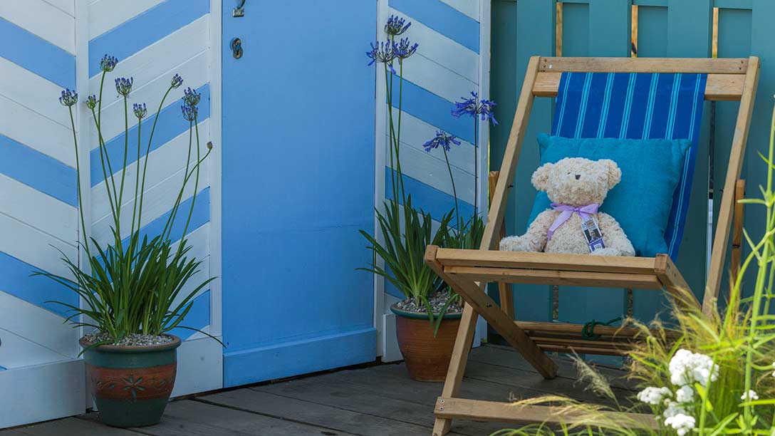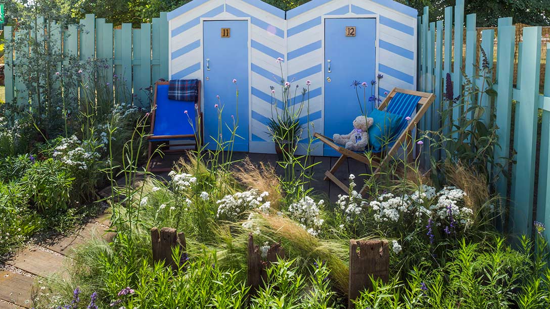 Inspired by the coastline of Southend-on-Sea, the pier and the surrounding beach, the Southend Council ‘By The Sea’ garden offers a peaceful idyll situated by the coast. This relaxed and practical space features cool, calming blues and naturalistic planting.A gravel path meanders through planting that reflects the sea’s waves and leads to a decking area, inspired by the local pier, which incorporates a section of railway track reminiscent of the original rails. The planting has been chosen to cope with a semi-exposed coastal location and is a mix of blue, purple, silver and white-flowered or foliage plants. Eucalyptus gunnii adds height to the garden and Buddleja davidii helps to balance the space and add fragrance.
