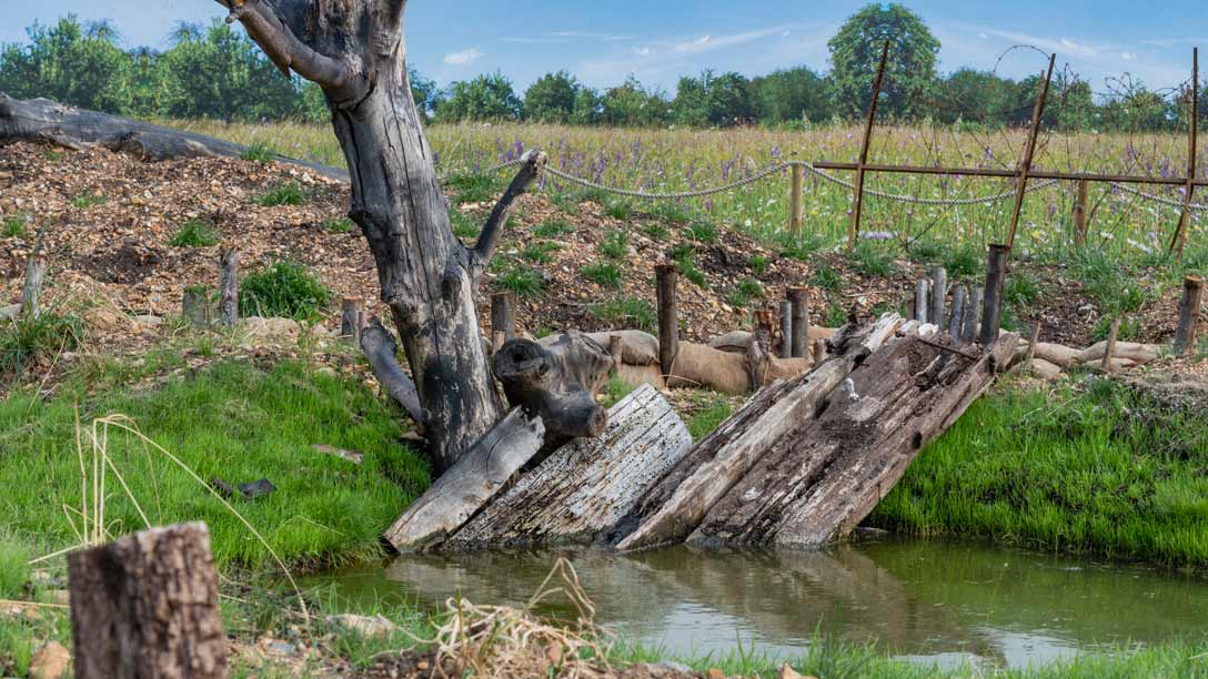 - The artefacts found in the landscape, such as the barbed wire, wheels from gun carriages and horseshoes, are genuine relics from the battlefields of the First World War. The landscape was dressed with the relics by members of the 10th Battalion Essex Regiment Living History
